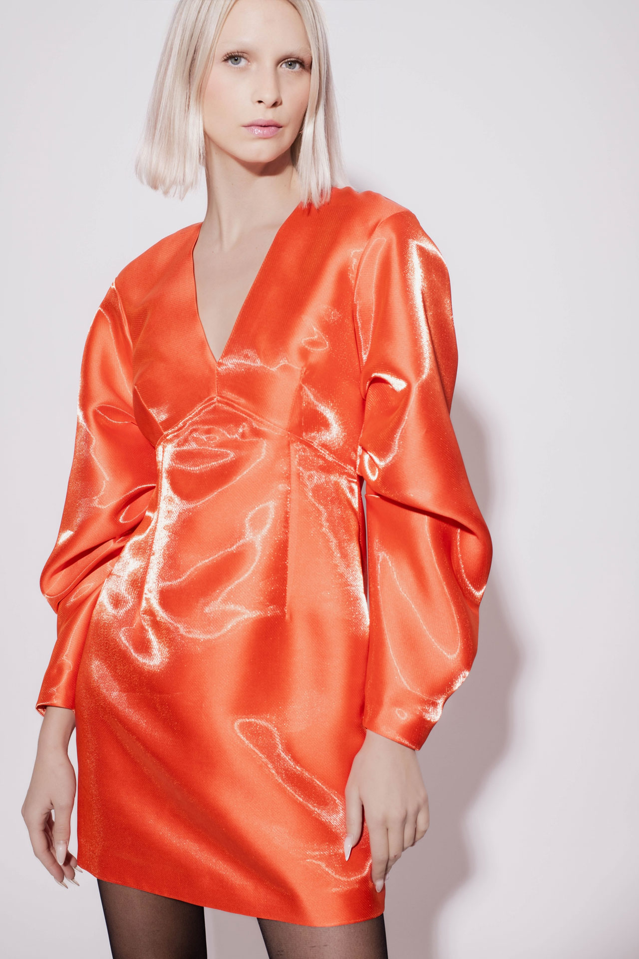 A laminated satin mini dress in a vibrant orange shade delivers a striking, high-shine finish that immediately draws attention. Voluminous sleeves and a deep V-neckline create a bold, couture-inspired silhouette perfect for evening events and special occasions.