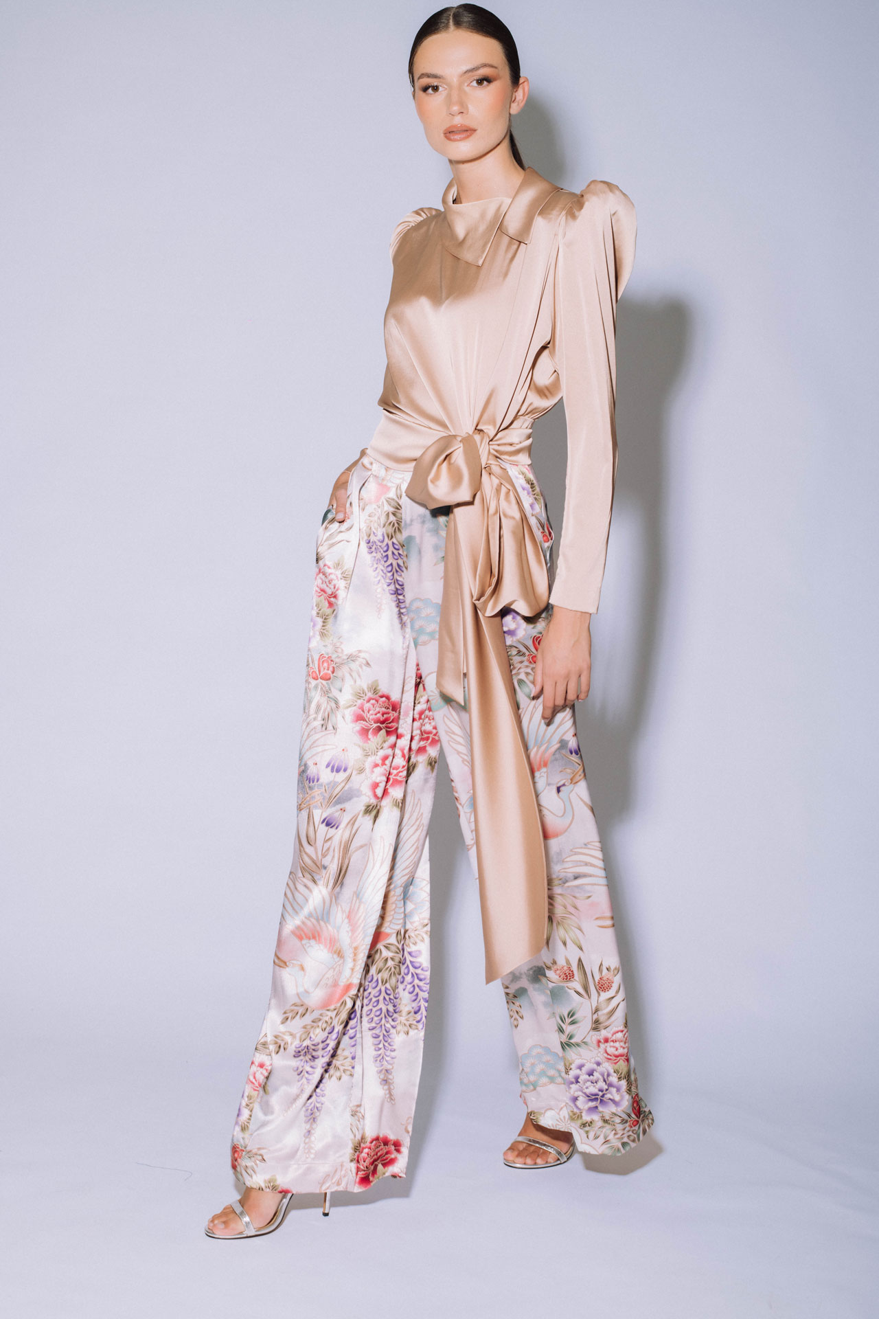 High-waisted wide-leg trousers made of luxurious satin fabric with an elegant sheen. They stand out with a rich oriental pattern featuring floral and bird motifs, giving the design a refined and exotic character. The trousers feature side pockets, hidden fastening, and a wide cut that elongates the silhouette while providing comfort. Perfect for special occasions or as a statement piece for daytime looks.