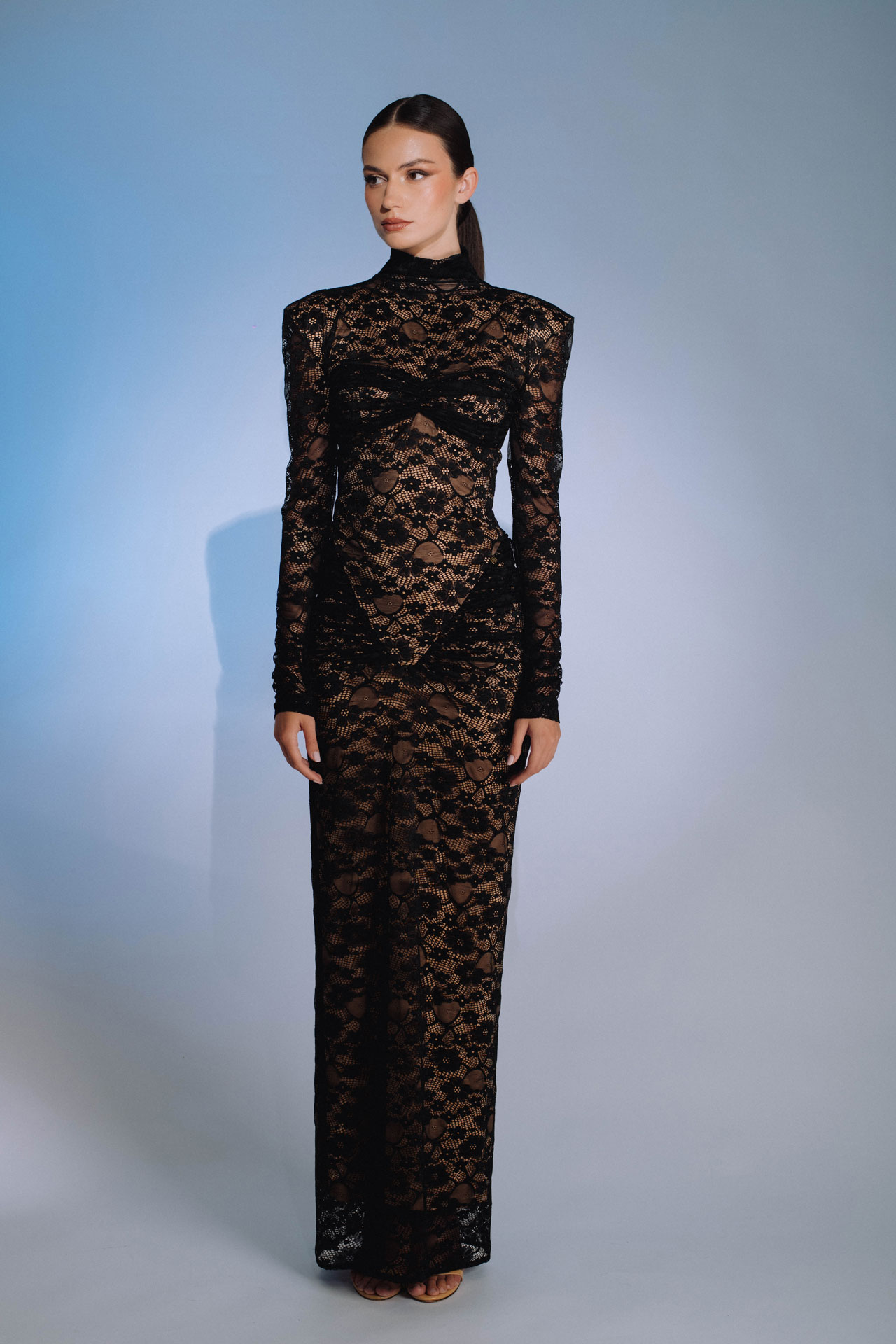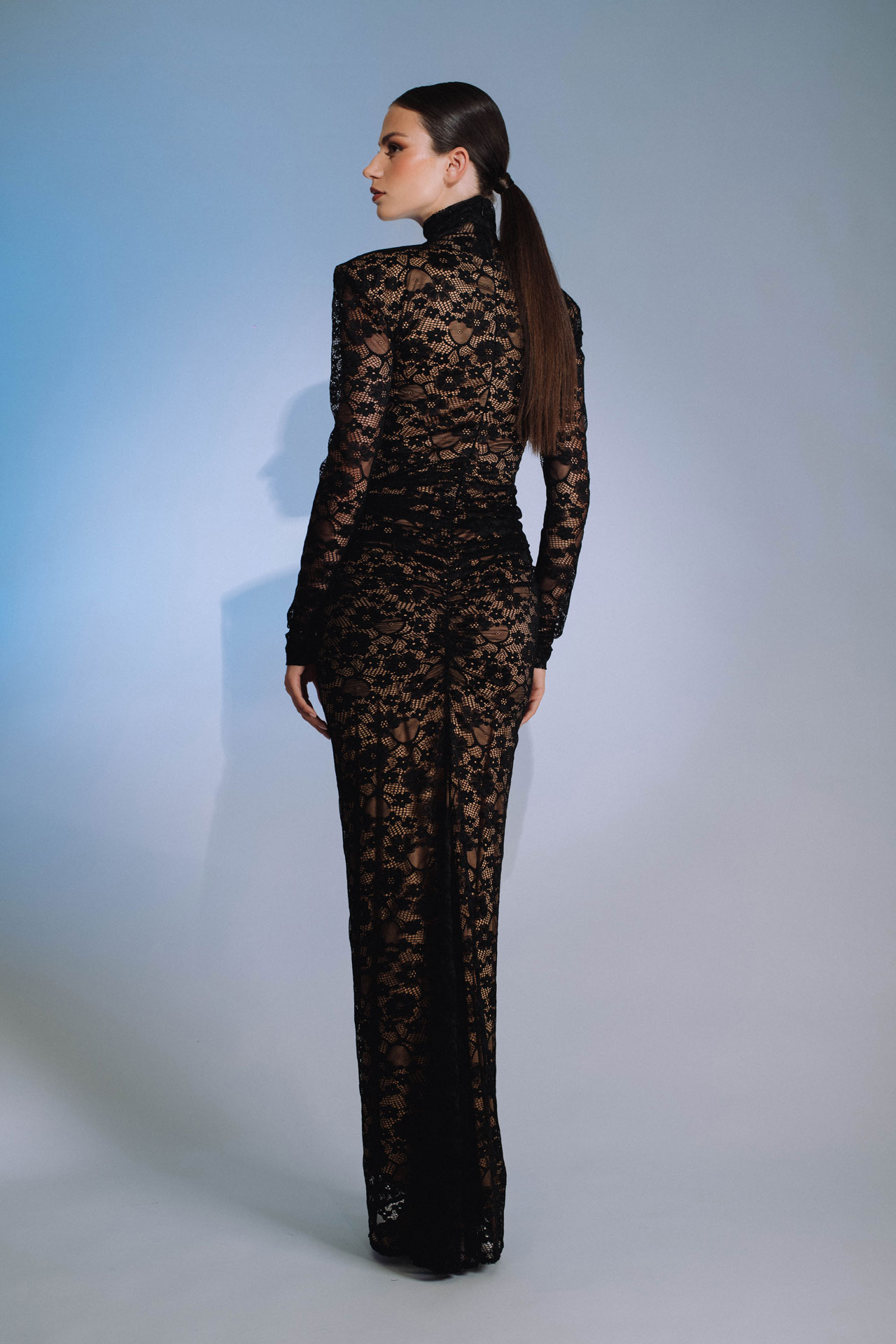 Duga crna haljina od čipke s cvjetnim uzorkom i dugim rukavima. Model ima visoki ovratnik, naglašena ramena i uski kroj koji prati liniju tijela, dok čipkasti uzorak pruža zavodljiv i elegantan dojam. Savršen izbor za glamurozne večernje prigode.