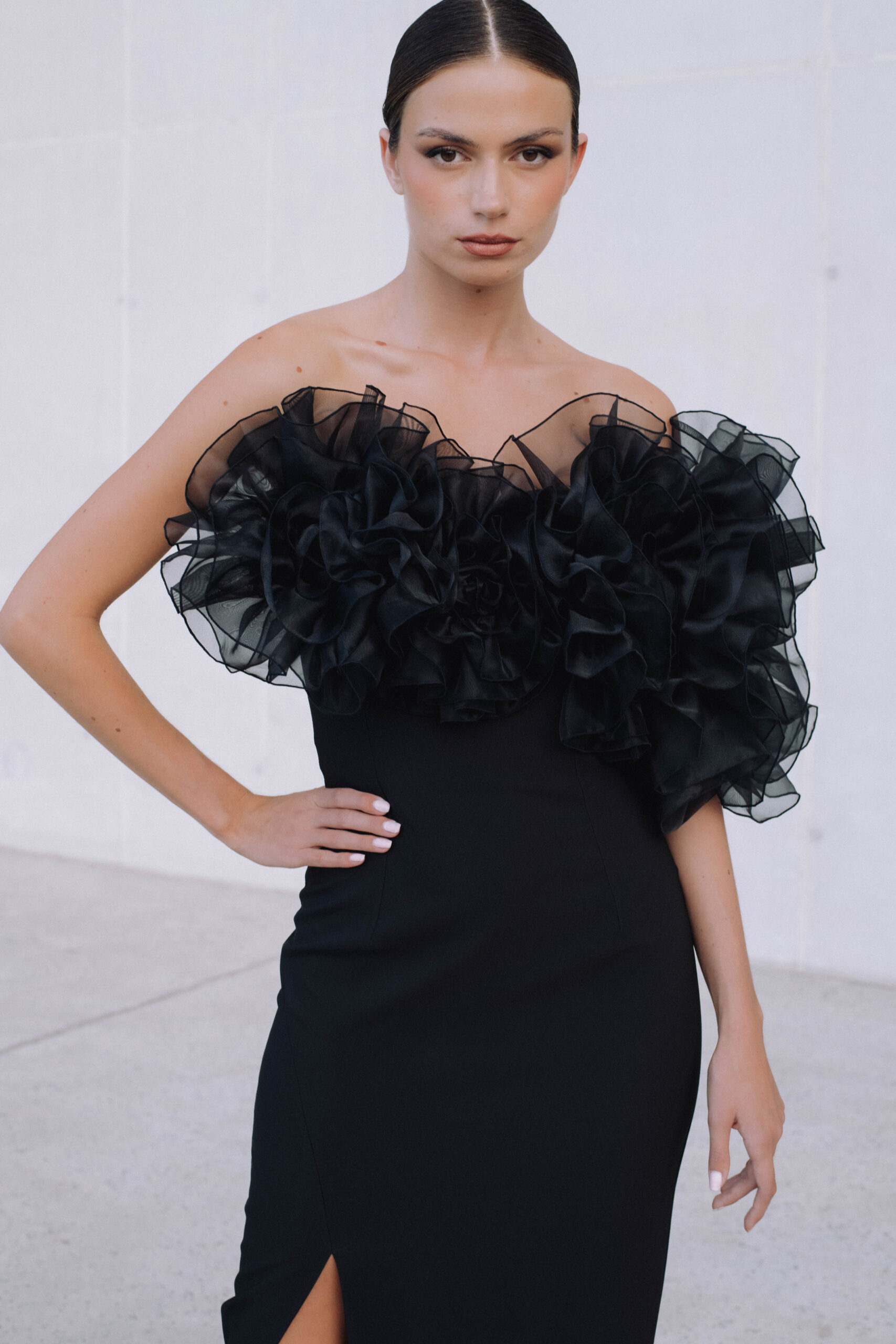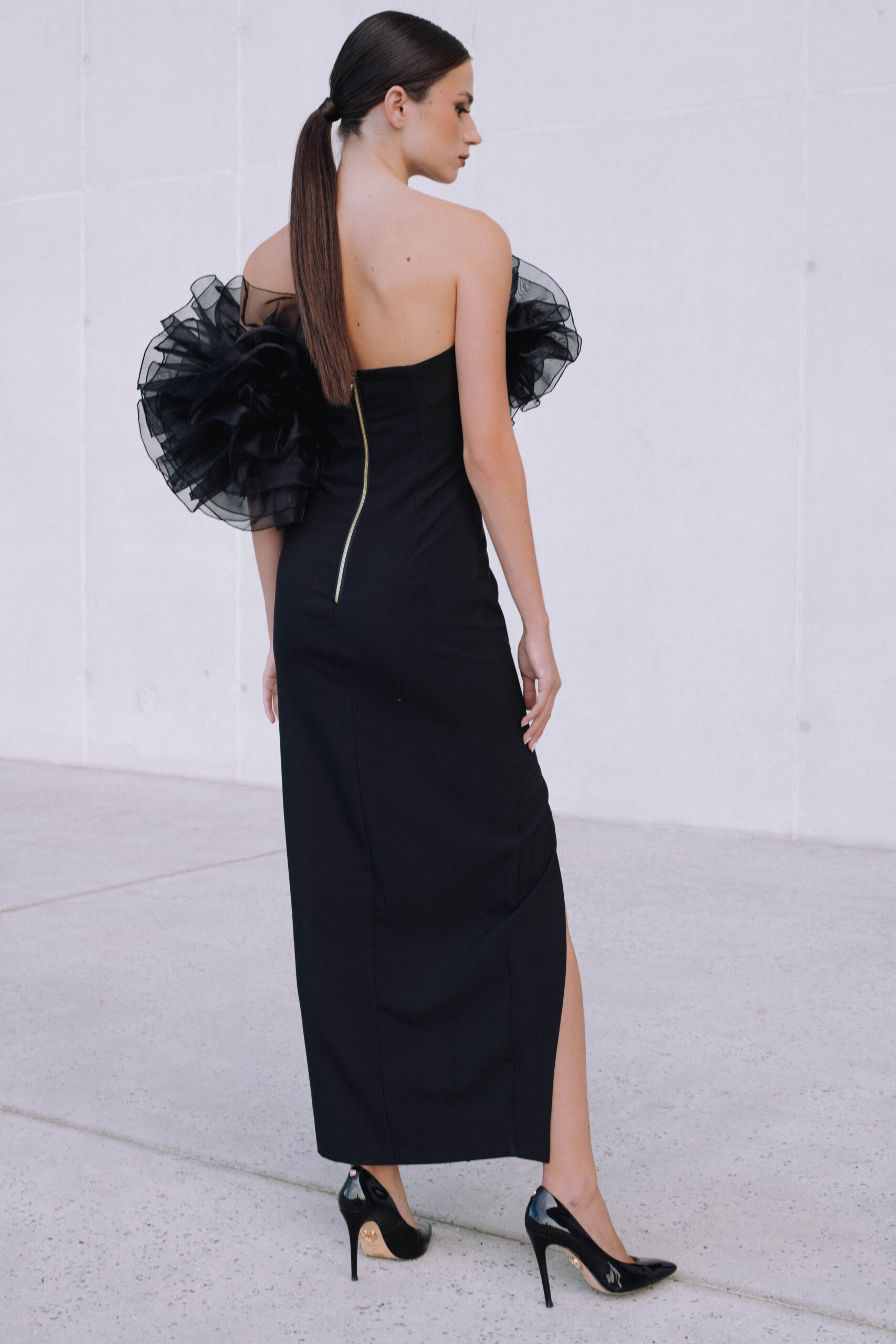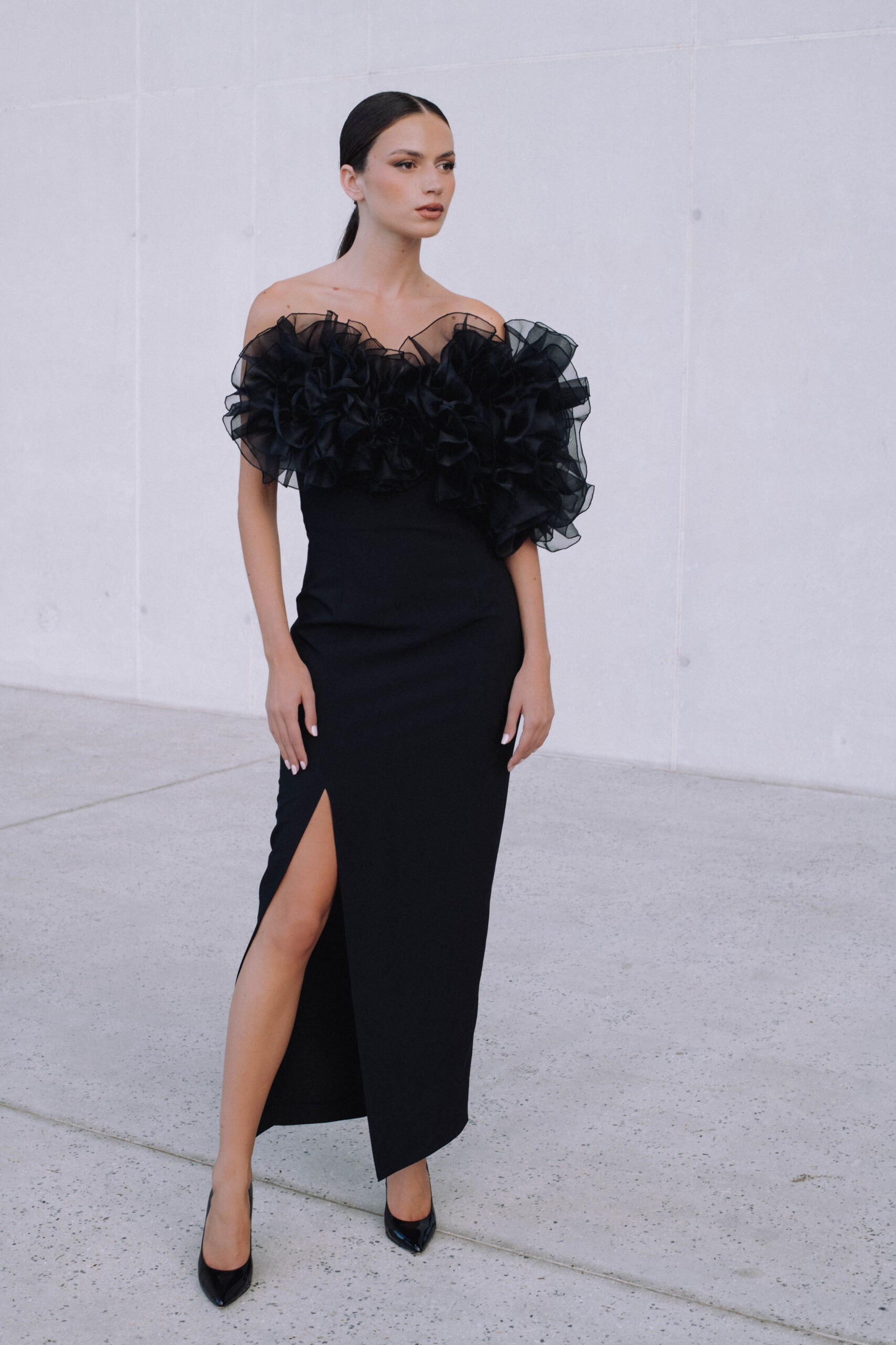 Elegantna duga crna haljina bez naramenica ističe ženstvenu siluetu i sofisticiran stil. Gornji dio krase raskošni cvjetovi od organdija koji dodaju dramatičan i moderan efekt. Duboki prorez sa strane i zlatni zatvarač na leđima upotpunjuju glamurozan izgled.