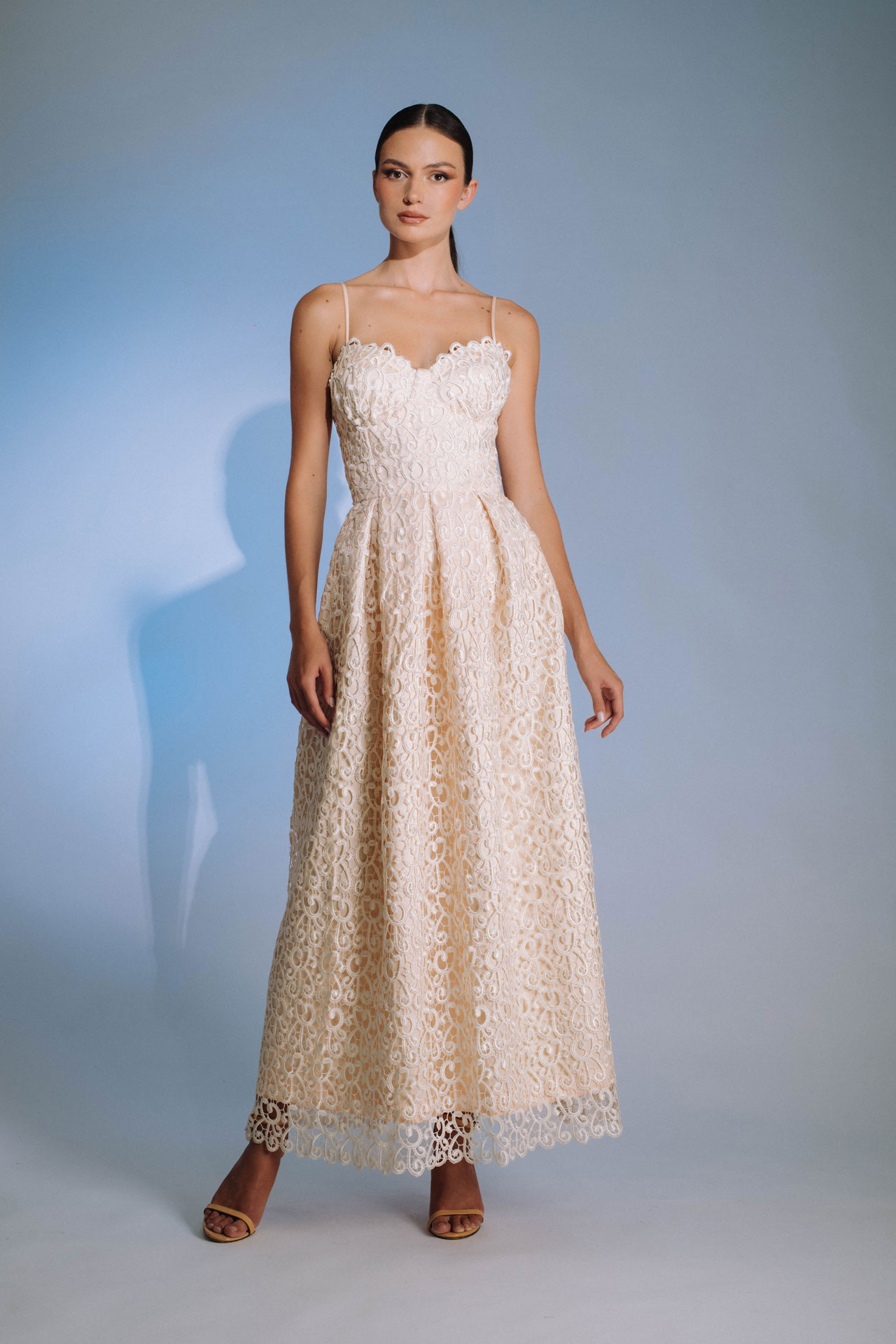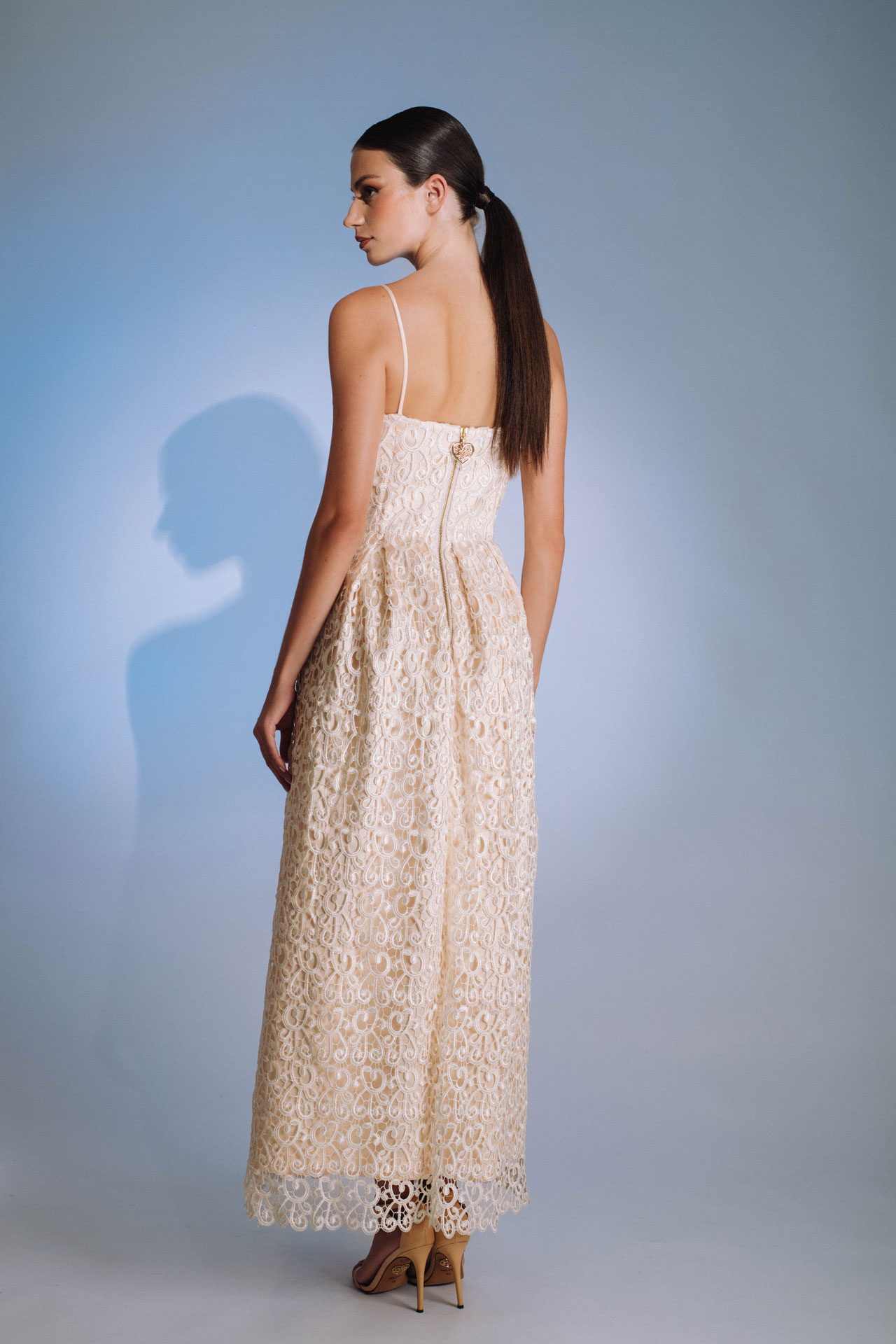 Elegantna midi haljina bez rukava izrađena od nježne čipke s romantičnim uzorkom. Model dolazi s tankim naramenicama, profinjenim srcolikim izrezom i suknjom s bogatim faldama koje stvaraju ženstvenu siluetu.