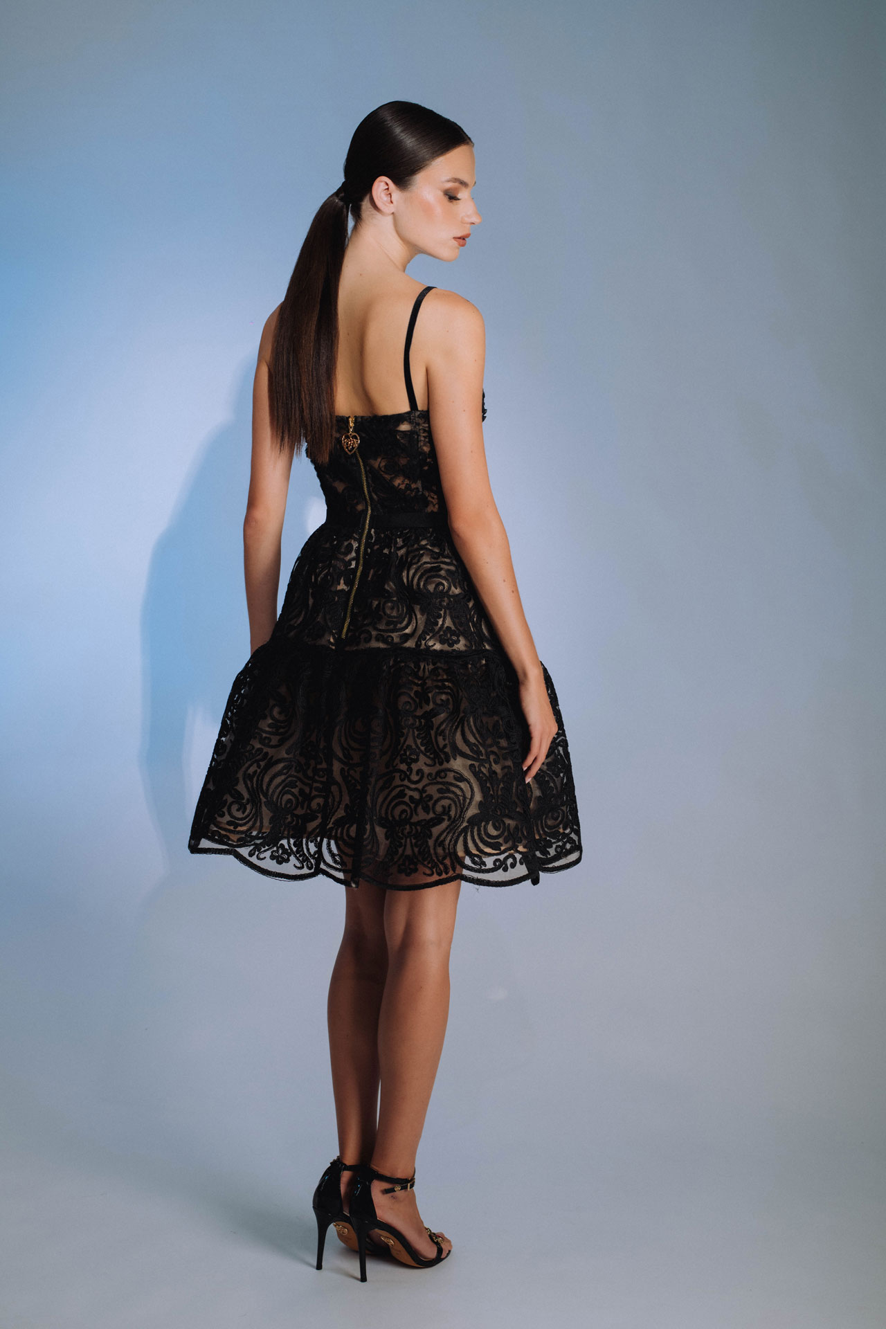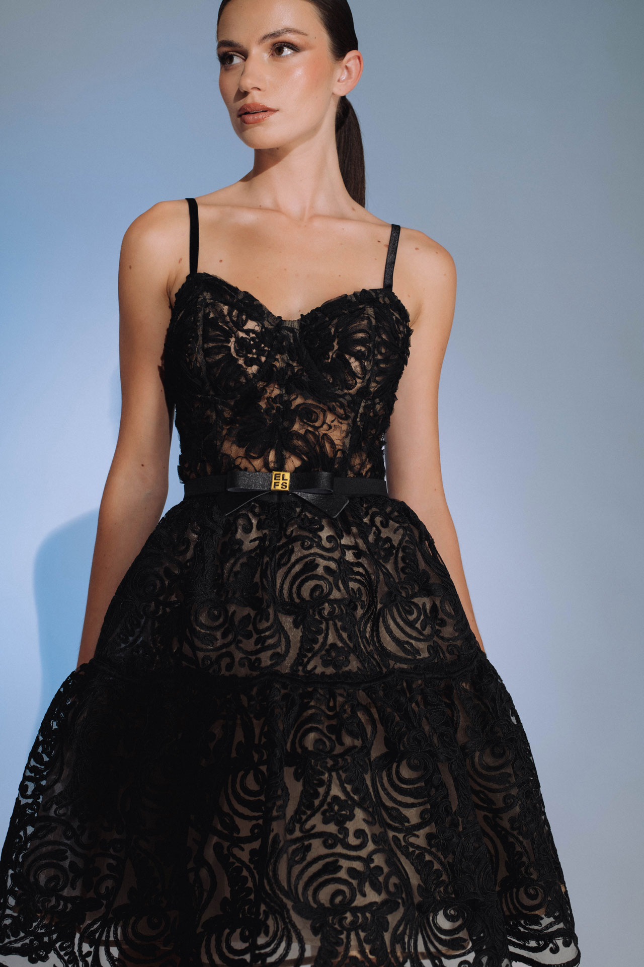 Crna kratka haljina od prozirne čipke s trodimenzionalnim uzorkom, naglašenim strukom i slojevitom suknjom. Elegantna i ženstvena, idealna za večernje i svečane prigode.