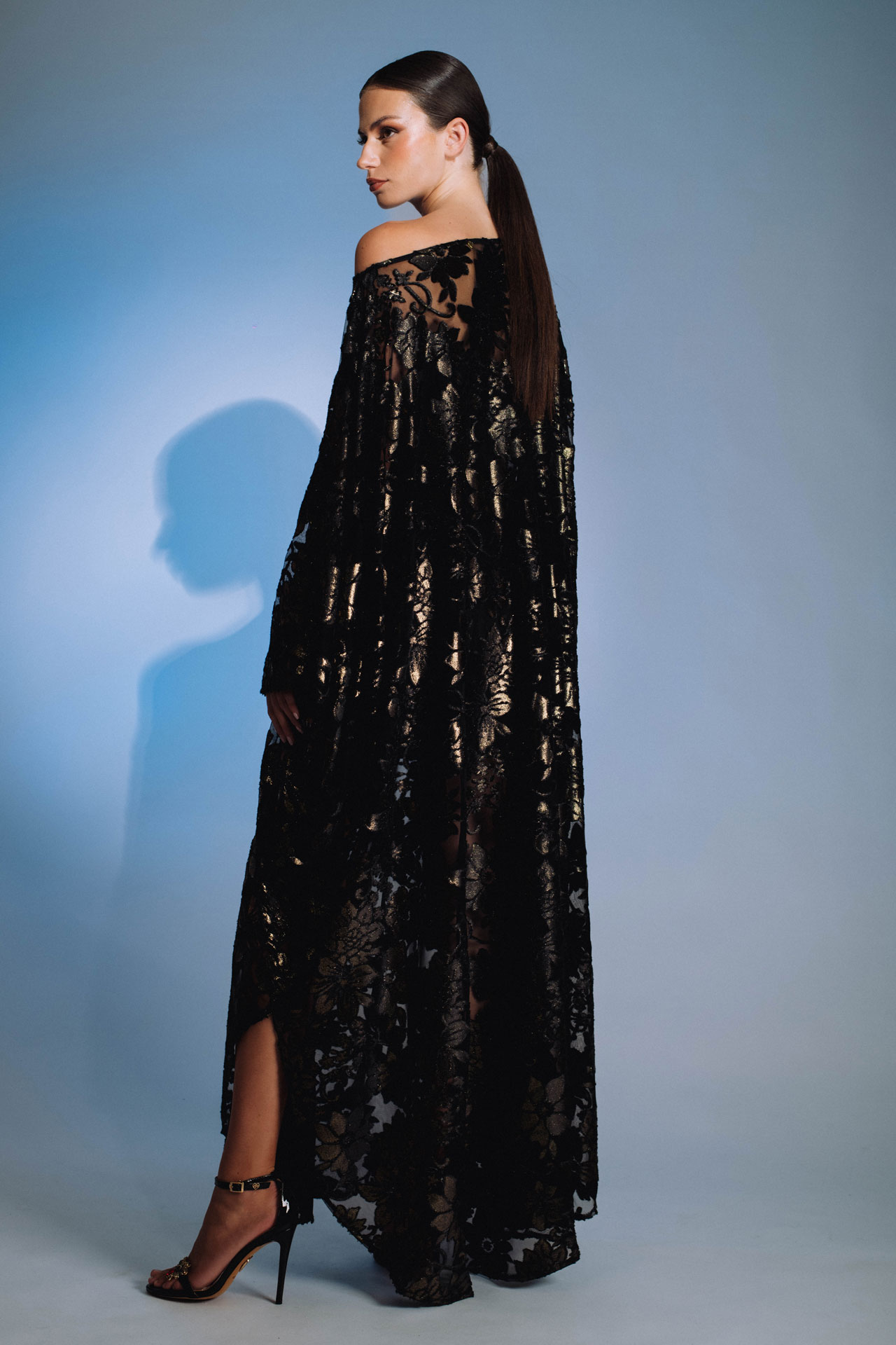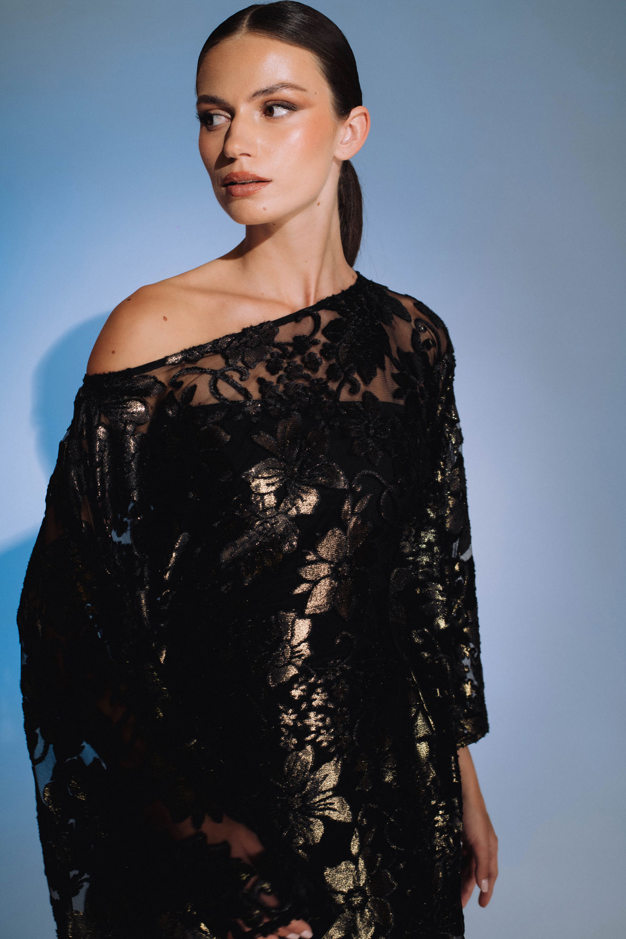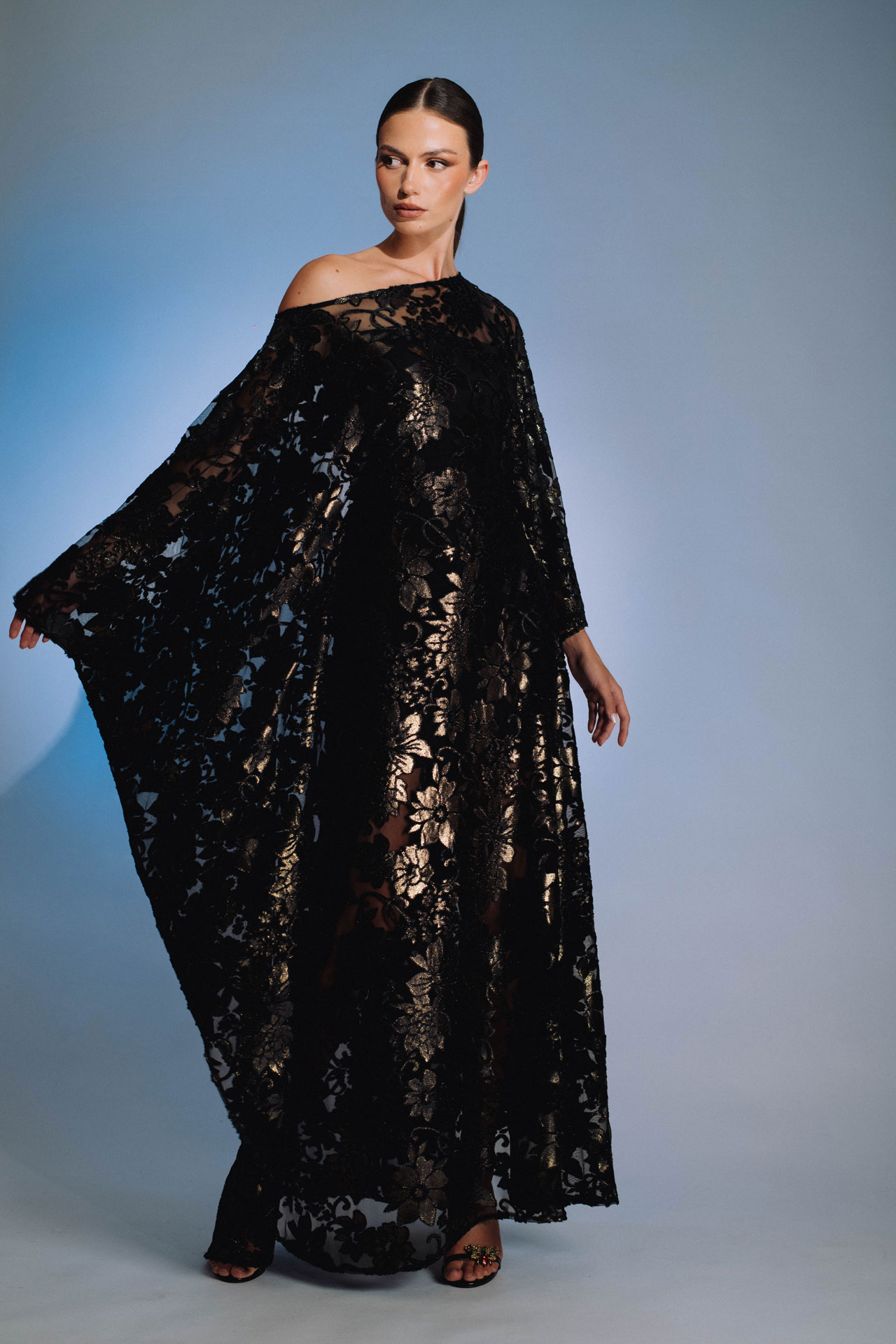 Elegantna duga haljina s asimetričnim izrezom na jedno rame. Izrađena od luksuznog devoré materijala s floralnim uzorkom i zlatnim sjajem, odiše profinjenošću i glamuroznošću. Lepršavi kroj i prozračna tkanina stvaraju dojam sofisticiranosti – savršen izbor za svečane večernje prilike.